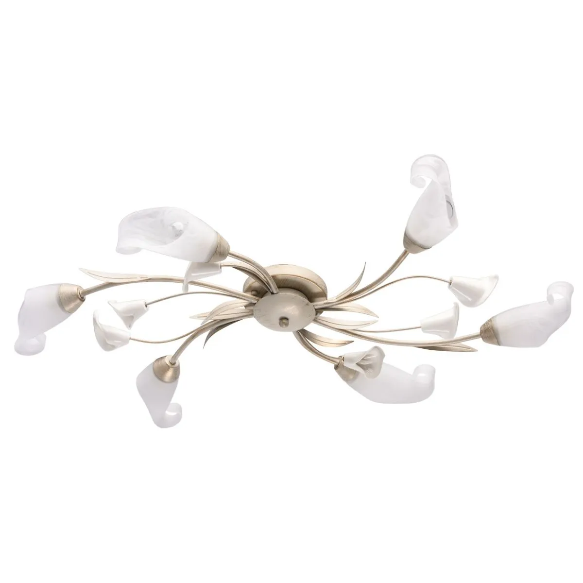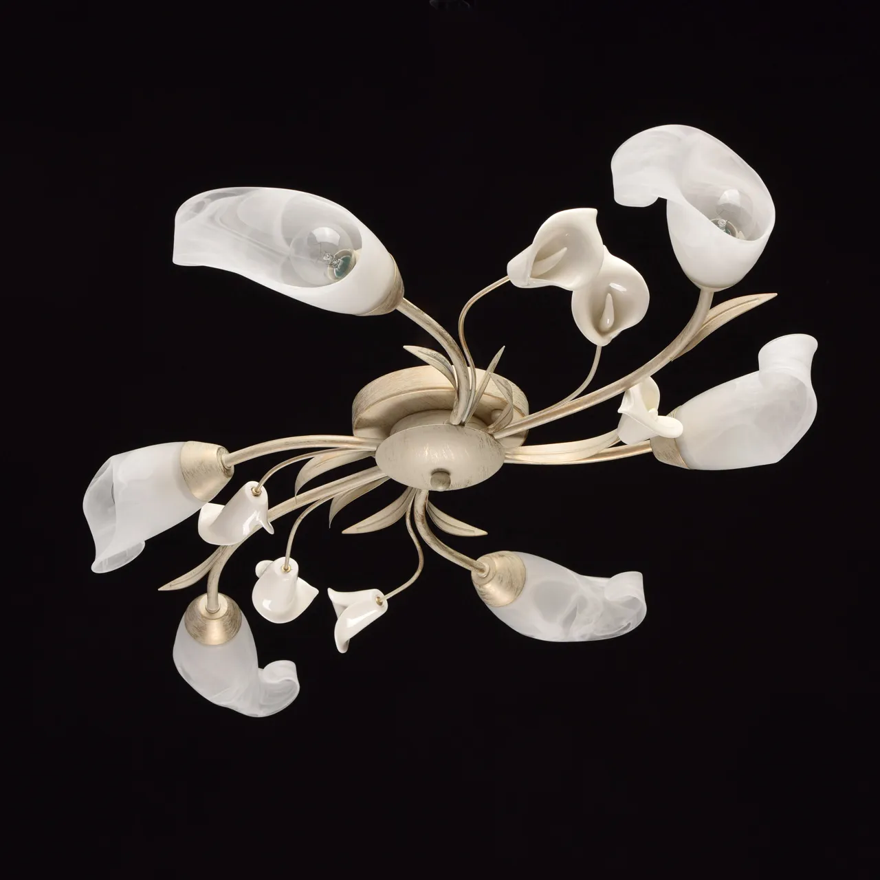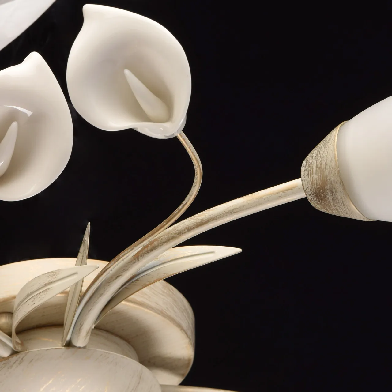 Металлическое основание окрашено в цвет слоновой кости с золотой патиной. Стеклянные плафоны. Белый
