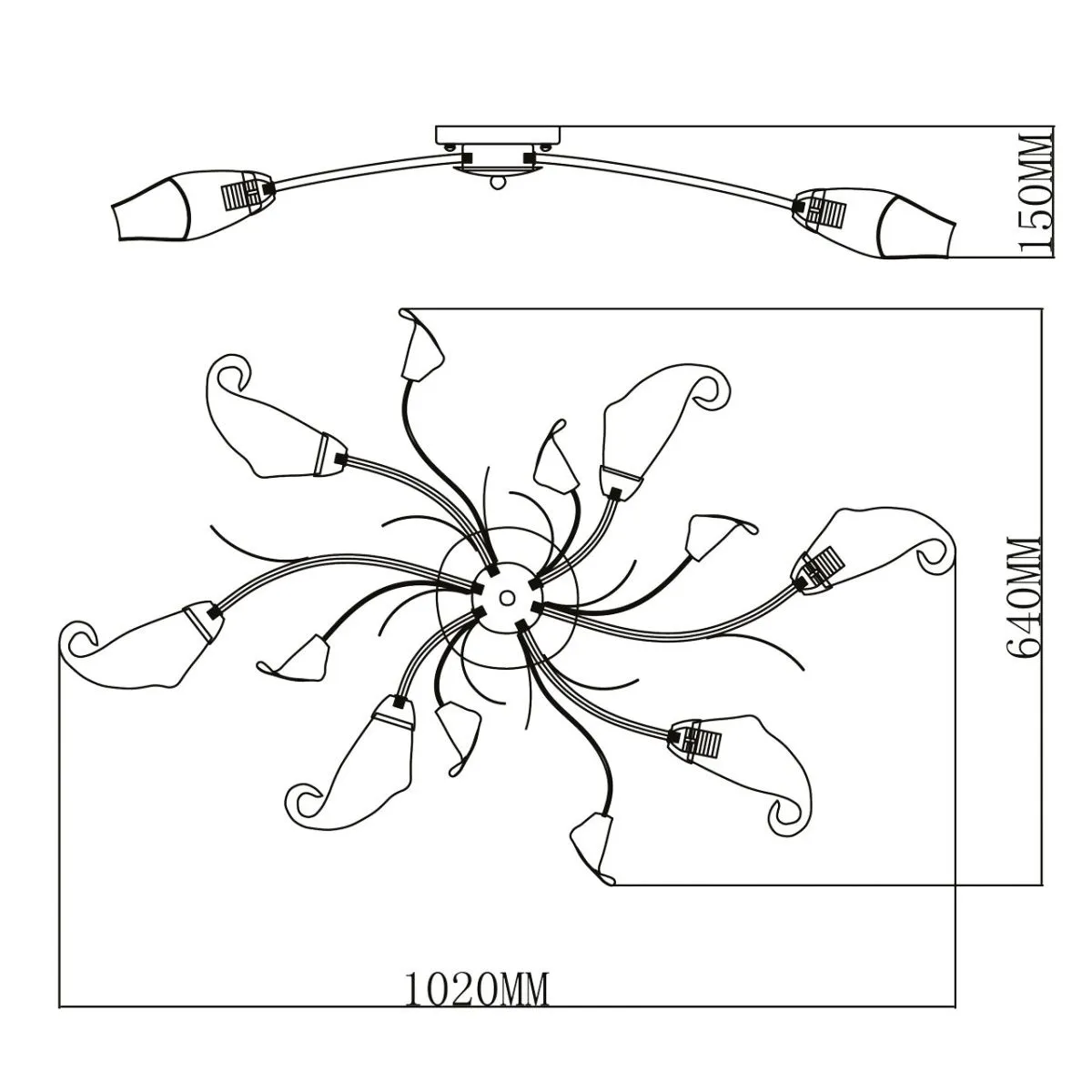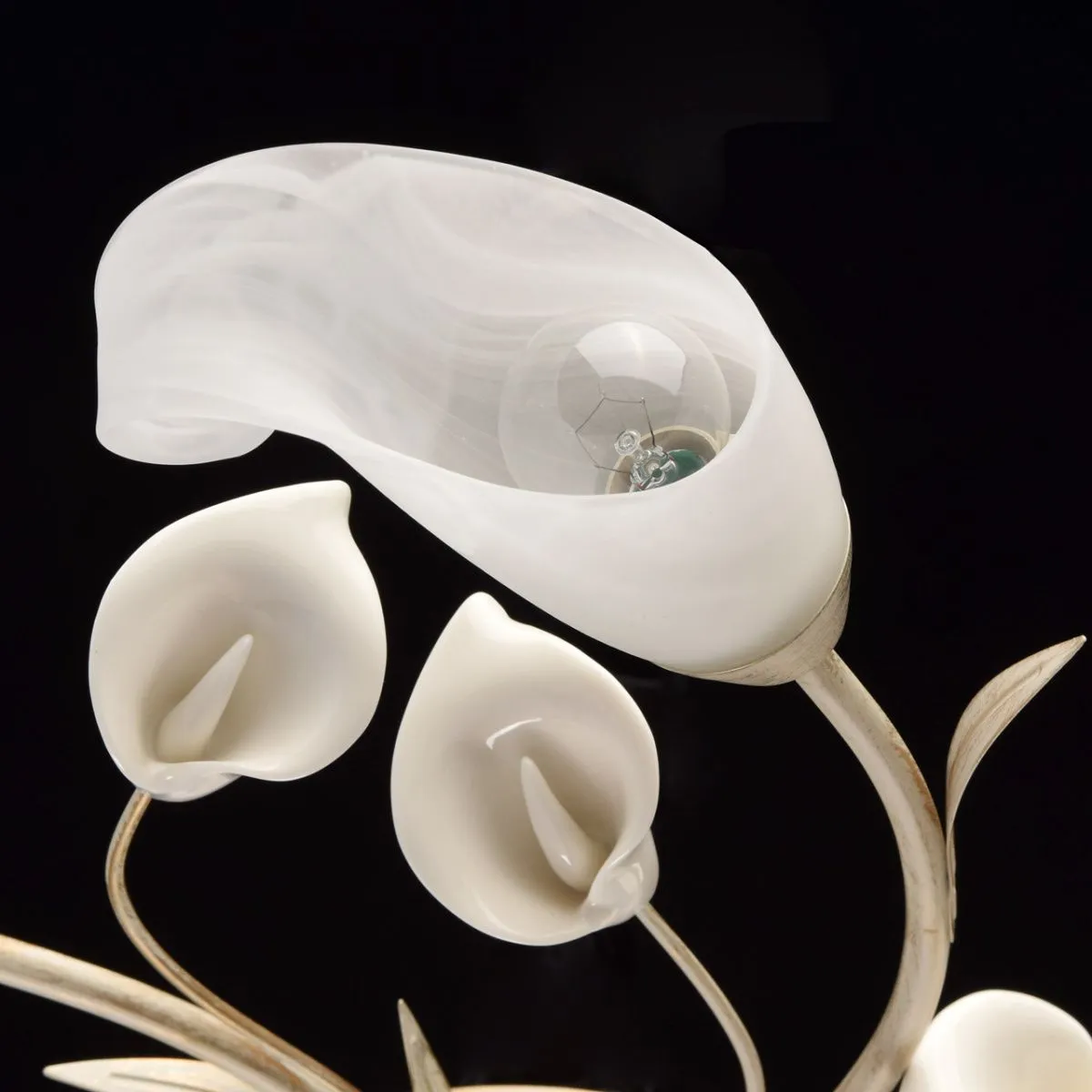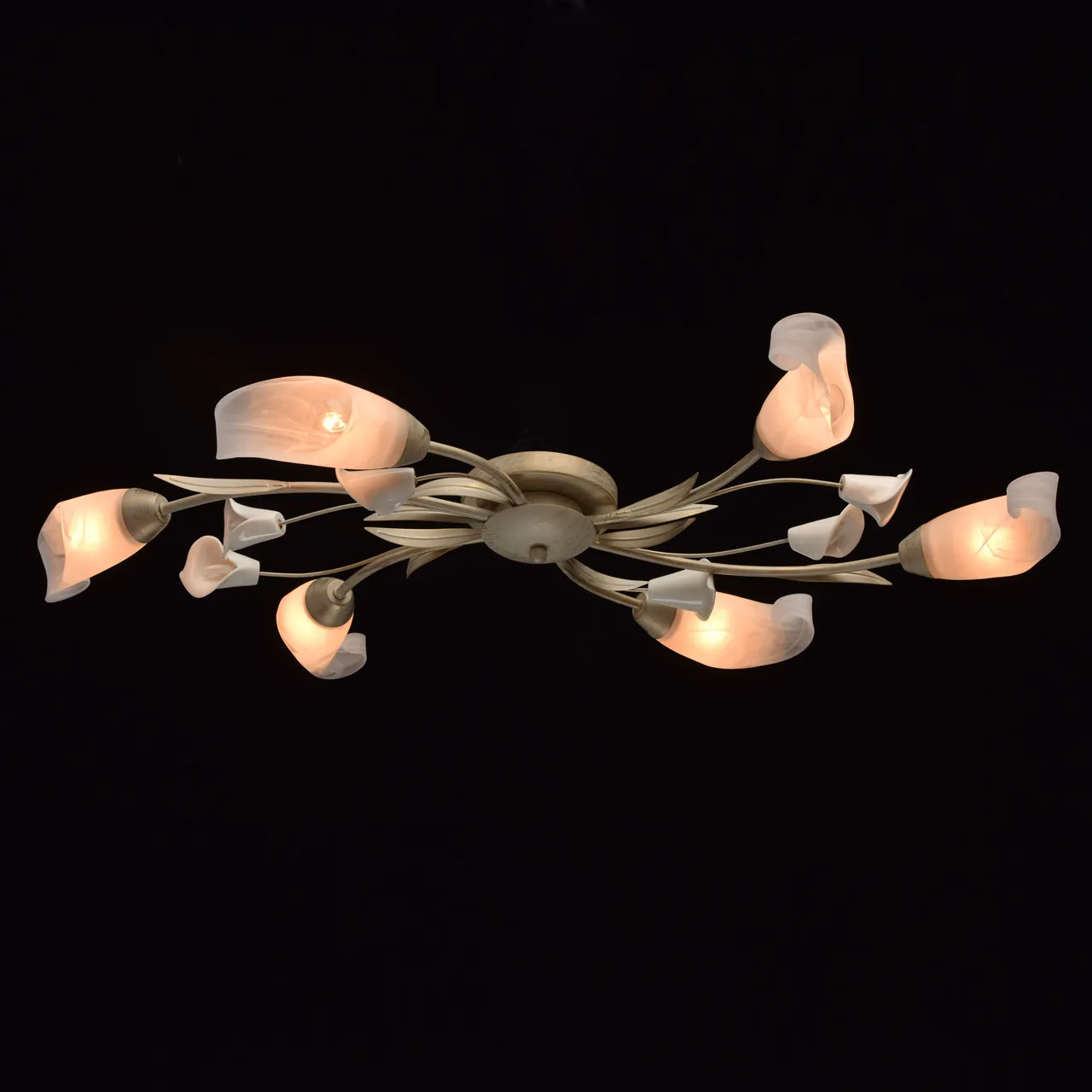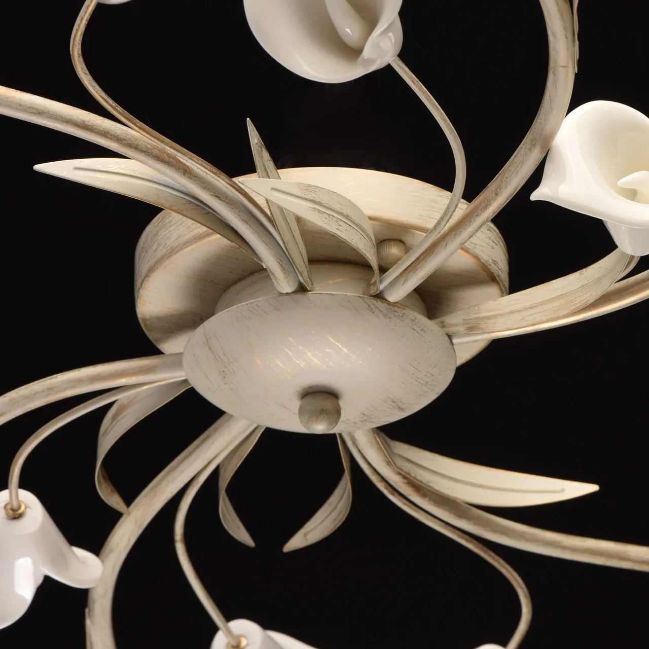 Металлическое основание окрашено в цвет слоновой кости с золотой патиной. Стеклянные плафоны. Белый