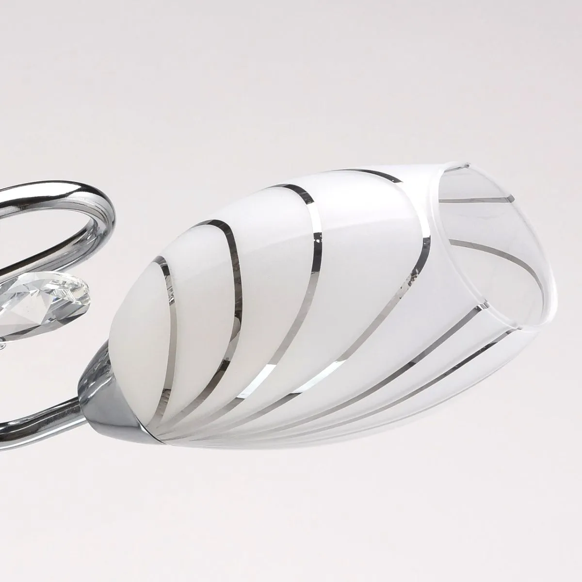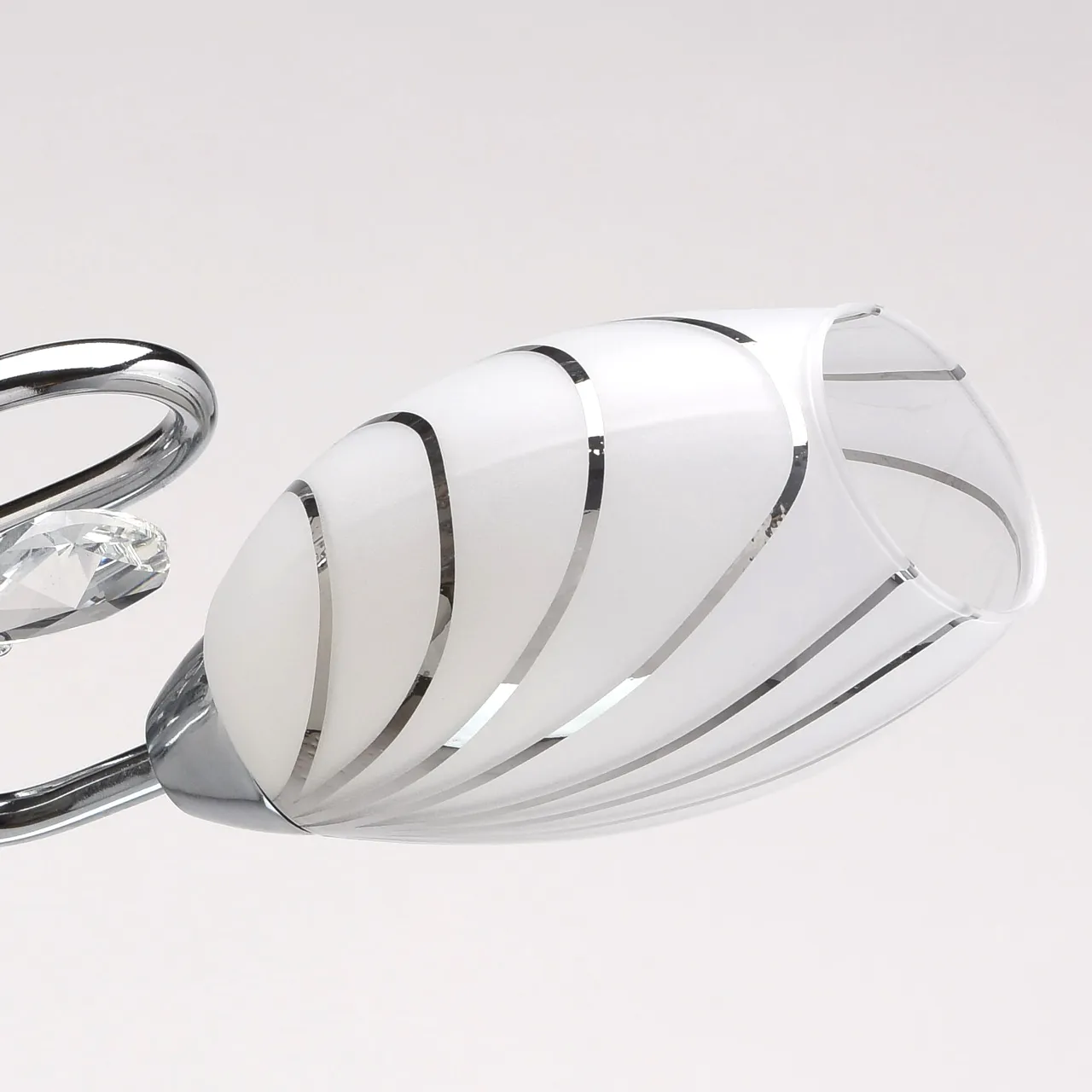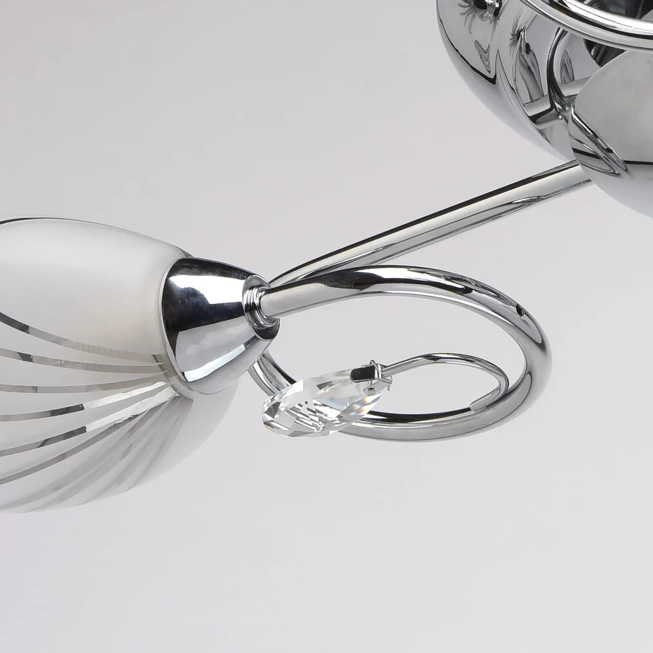 Металлическое основание цвета хрома, плафоны из матового стекла с гальванизированным рисунком, декор
