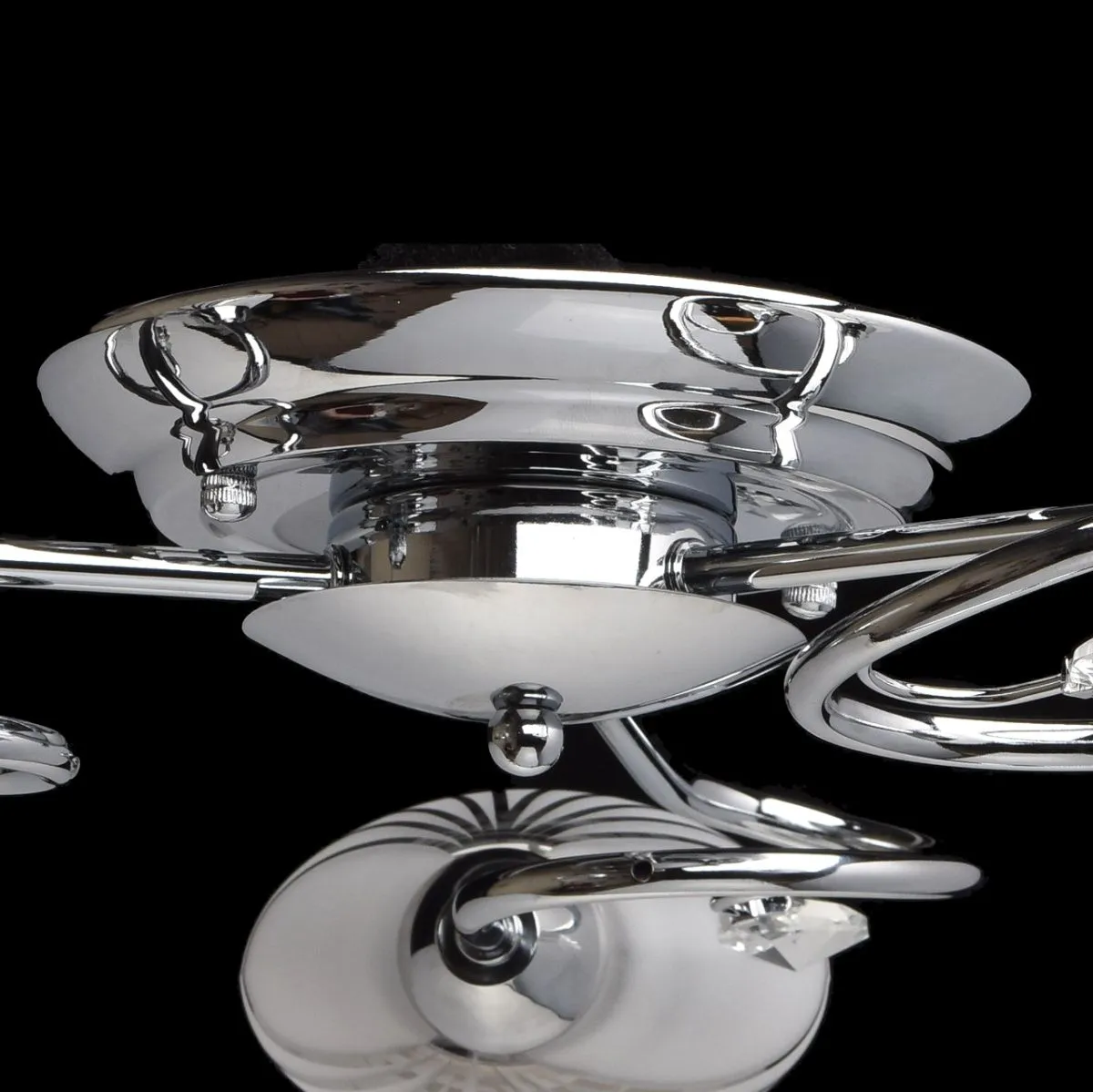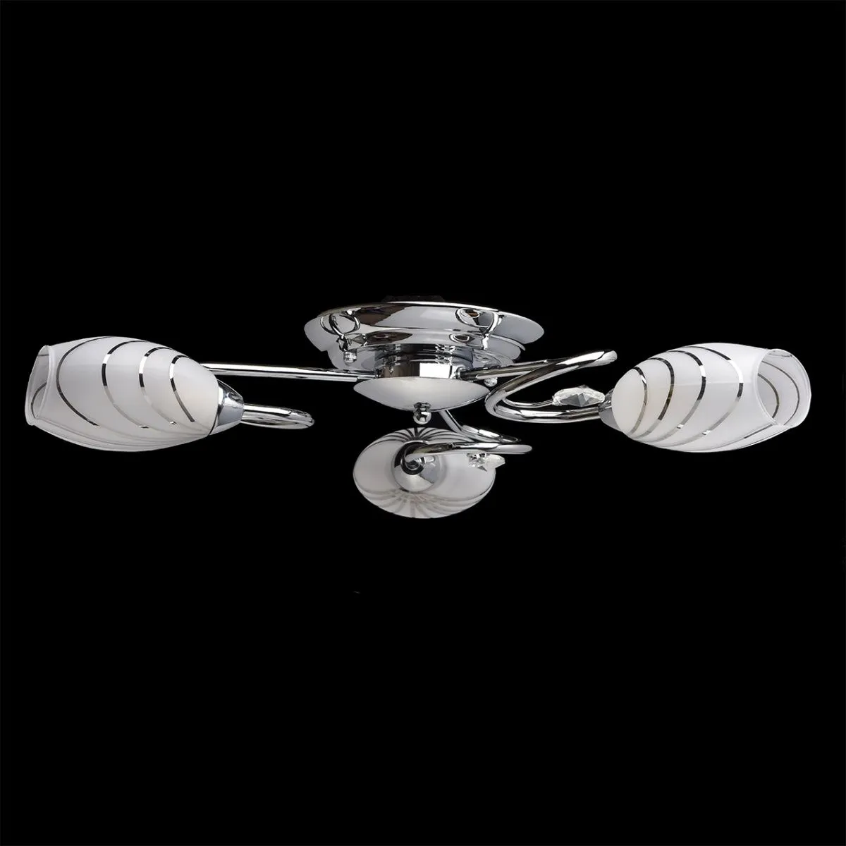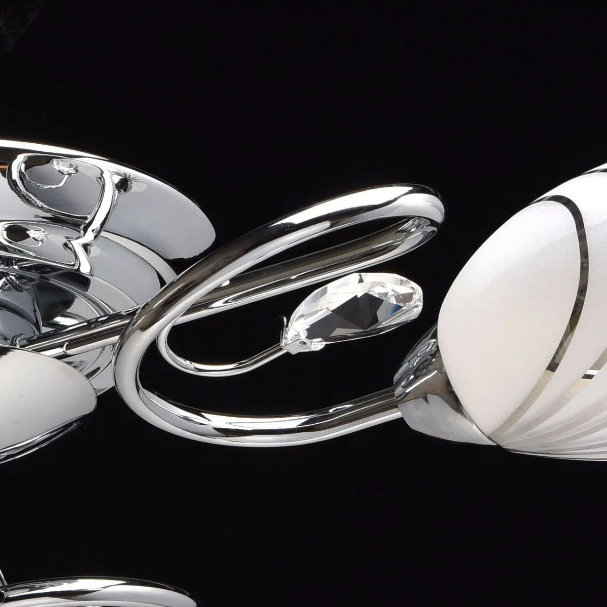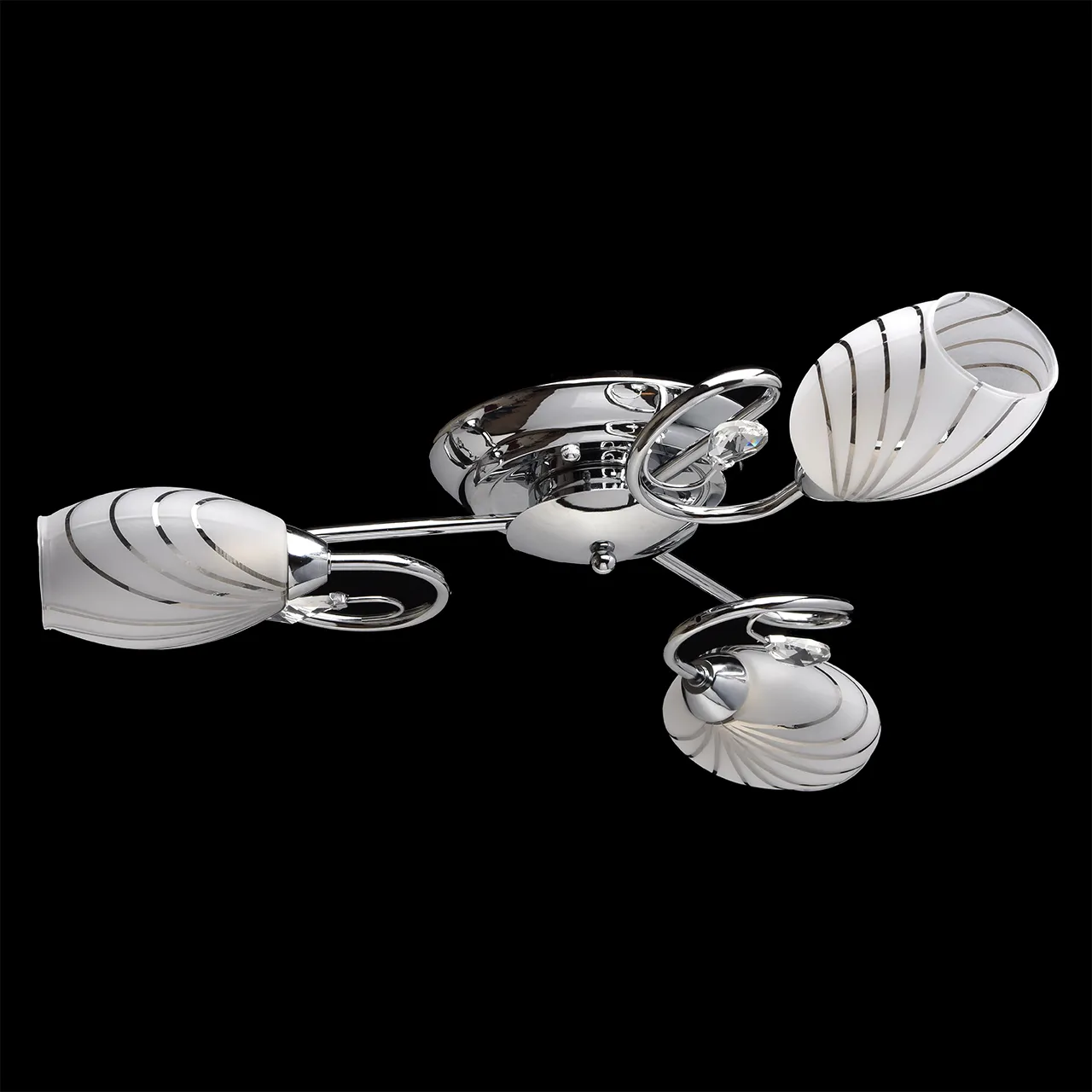 Металлическое основание цвета хрома, плафоны из матового стекла с гальванизированным рисунком, декор