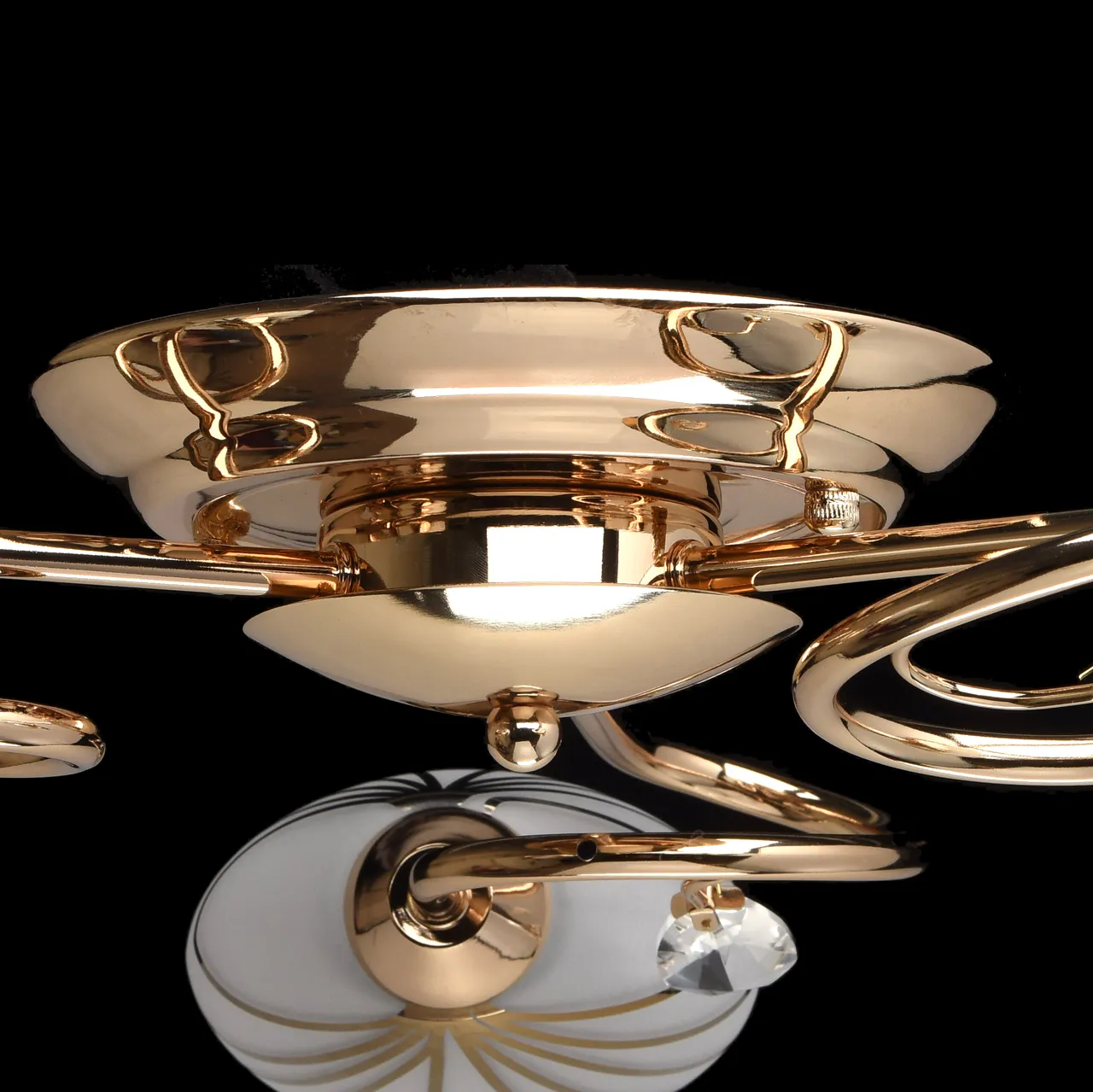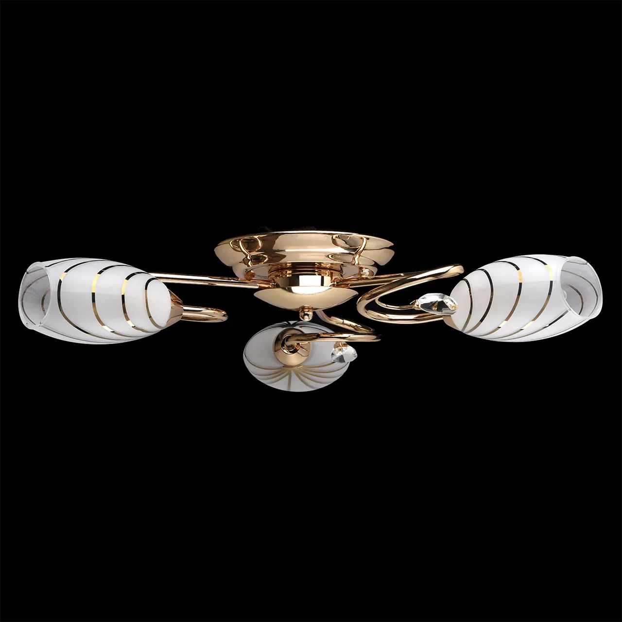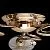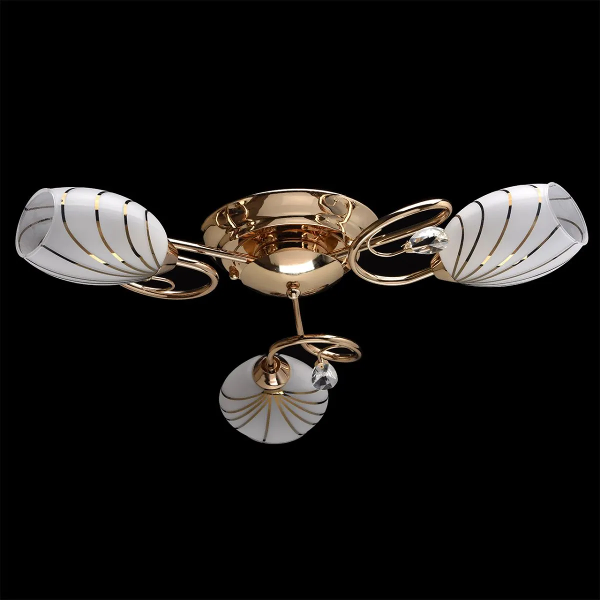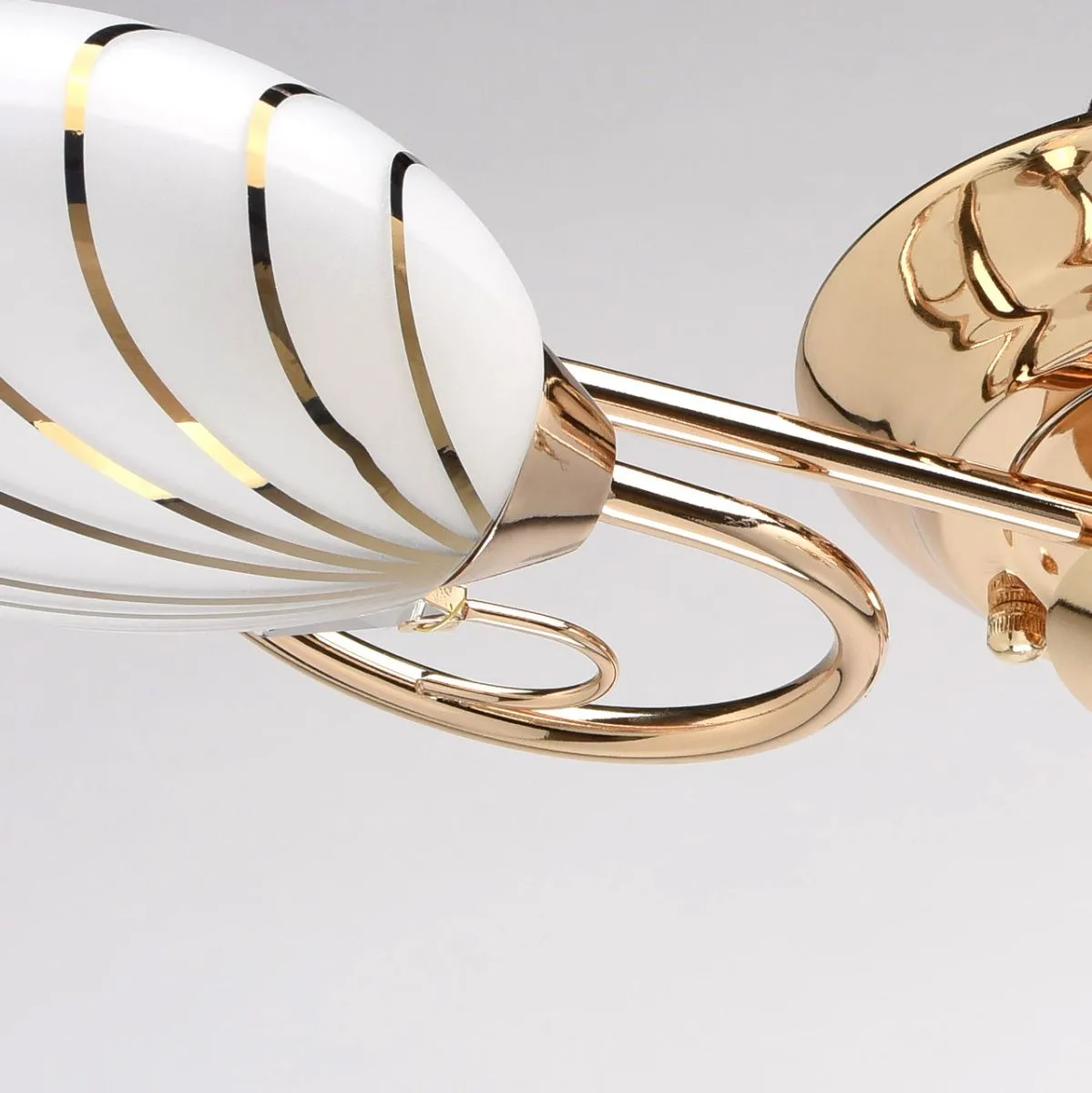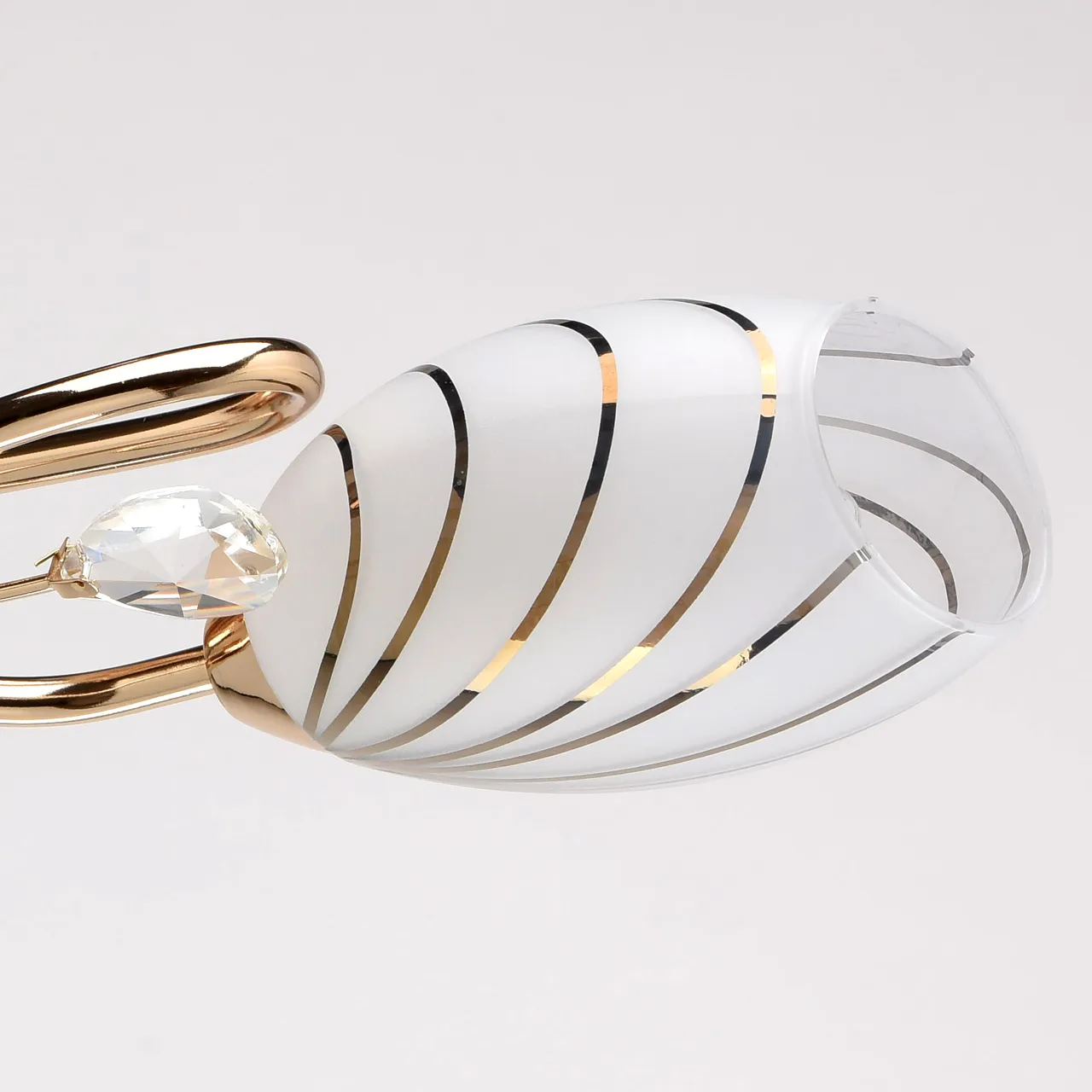 Металлическое основание цвета золота, плафоны из матового стекла с гальванизированным рисунком, деко