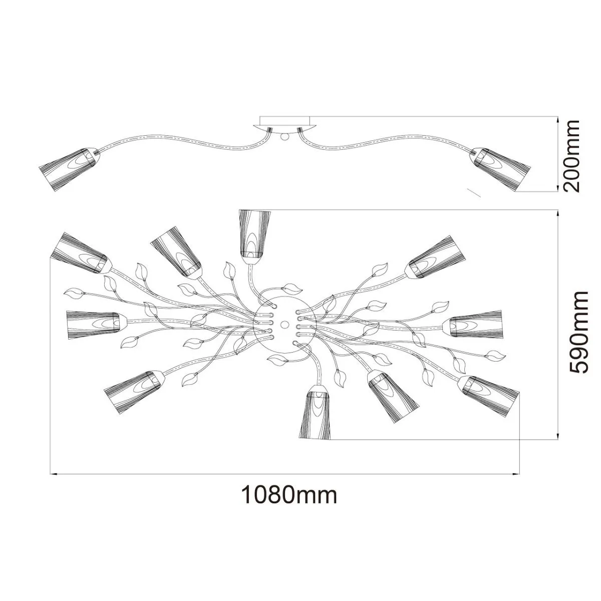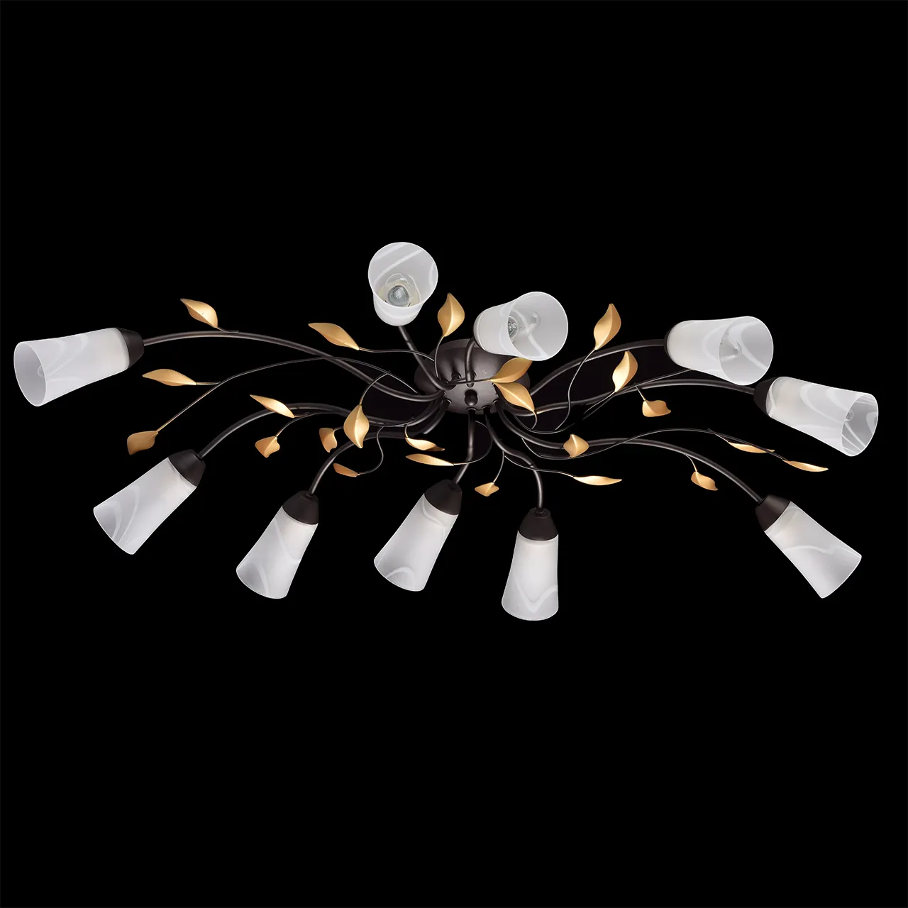 Металлическое основание коричневого цвета. Плафоны: матовое стекло. Декор: металл цвета золота.